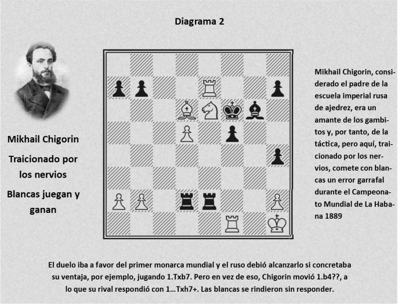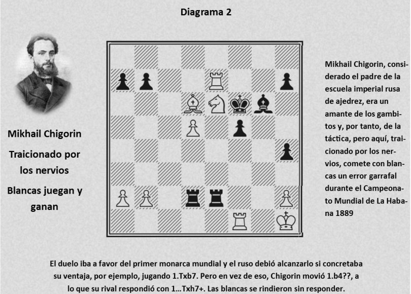 Mikhail Chigorin, considerado el padre de la escuela imperial rusa de ajedrez, era un amante de los gambitos y, por tanto, de la táctica, pero aquí, traicionado por los nervios, comete con blancas un error garrafal durante el Campeonato Mundial de La Habana 1889. El duelo iba 11.5-10.5 a favor del primer monarca mundial y el ruso debió alcanzarlo si concretaba su ventaja, por ejemplo, jugando 1.Txb7. Pero en vez de eso, Chigorin movió 1.b4??, a lo que su rival respondió con 1…Txh7+. Las blancas se rindieron sin responder.
