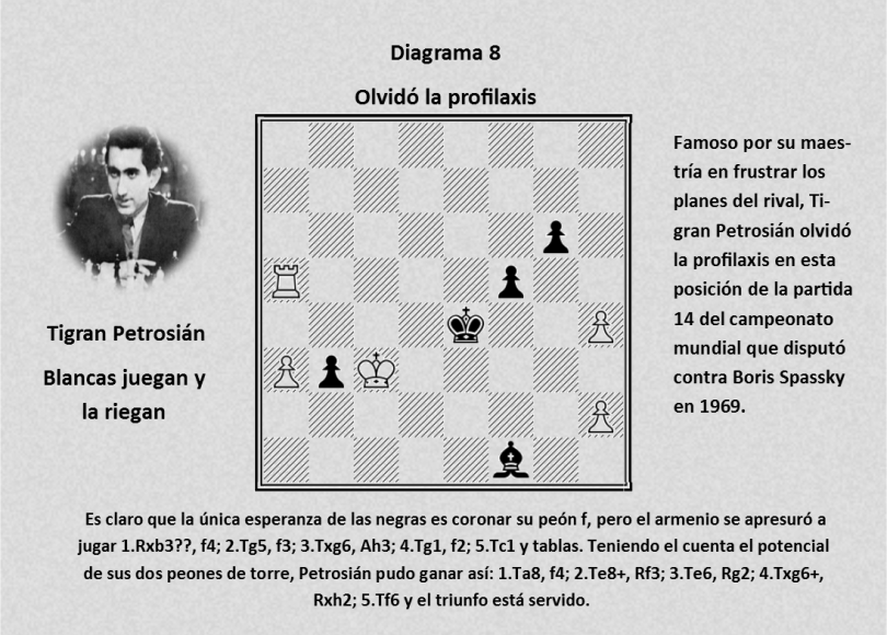 Famoso por su maestría en frustrar los planes del rival, Tigran Petrosián olvidó la profilaxis en esta posición de la partida 14 del campeonato mundial que disputó contra Boris Spassky en 1969. Es claro que la única esperanza de las negras es coronar su peón f, pero el armenio se apresuró a jugar 1.Rxb3??, f4; 2.Tg5, f3; 3.Txg6, Ah3; 4.Tg1, f2; 5.Tc1 y tablas. Teniendo el cuenta el potencial de sus dos peones de torre, Petrosián pudo ganar así: 1.Ta8, f4; 2.Te8+, Rf3; 3.Te6, Rg2; 4.Txg6+, Rxh2; 5.Tf6 y el triunfo está servido.