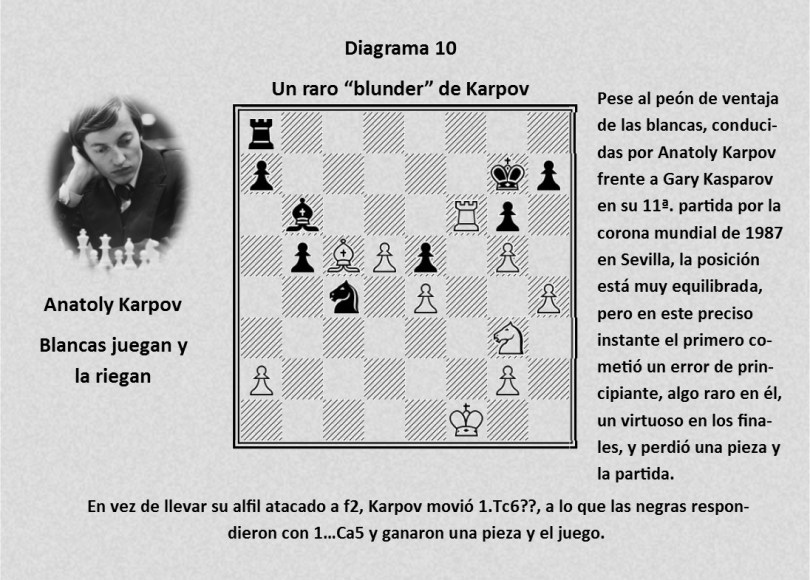 Pese al peón de ventaja de las blancas, conducidas por Anatoly Karpov frente a Gary Kasparov en su 11ª. partida por la corona mundial de 1987 en Sevilla, la posición está muy equilibrada, pero en este preciso instante el primero cometió un error de principiante, algo raro en él, un virtuoso en los finales, y perdió una pieza y la partida. En vez de llevar su alfil atacado a f2, Karpov movió 1.Tc6??, a lo que las negras respondieron con 1…Ca5 y ganaron una pieza y el juego.