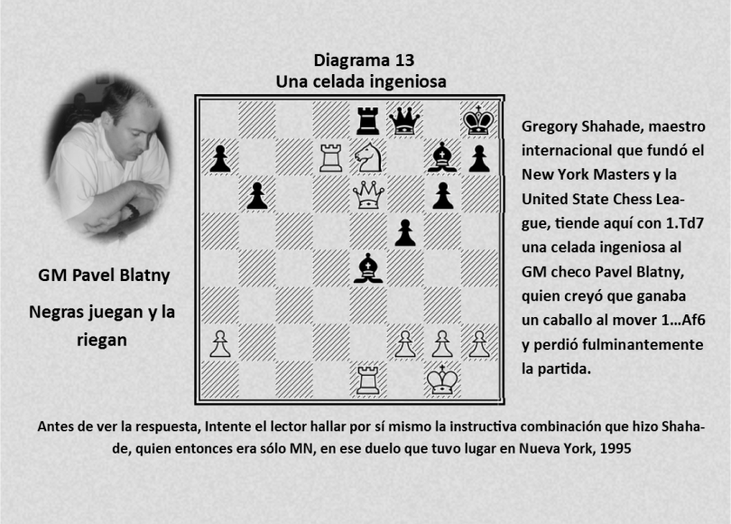 Gregory Shahade, maestro internacional que fundó el New York Masters y la United State Chess League, tiende aquí con 1.Td7 una celada ingeniosa al GM checo Pavel Blatny, quien creyó que ganaba un caballo al mover 1…Af6 y perdió fulminantemente la partida. Antes de ver la respuesta, Intente el lector hallar por sí mismo la instructiva combinación que hizo Shahade, quien entonces era sólo MN, en ese duelo que tuvo lugar en Nueva York, 1995.