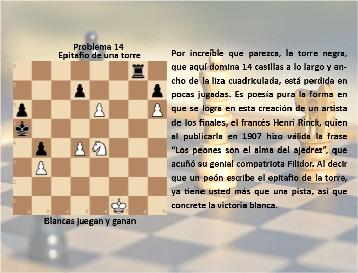 Por increíble que parezca, la torre negra, que aquí domina 14 casillas a lo largo y ancho de la liza cuadriculada, está perdida en pocas jugadas. Es poesía pura la forma en que se logra en esta creación de un artista de los finales, el francés Henri Rinck, quien al publicarla en 1907 hizo válida la frase “Los peones son el alma del ajedrez”, que acuñó su genial compatriota Filidor. Al decir que un peón escribe el epitafio de la torre, ya tiene usted más que una pista, así que concrete la victoria blanca.
