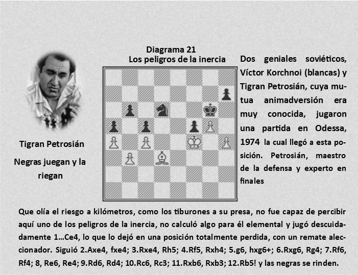 Dos geniales soviéticos, Víctor Korchnoi (blancas) y Tigran Petrosián, cuya mutua animadversión era muy conocida, jugaron una partida en Odessa, 1974, la cual llegó a esta posición. Petrosián, maestro de la defensa y experto en finales que olía el riesgo a kilómetros, como los tiburones a su presa, no fue capaz de percibir aquí uno de los peligros de la inercia, no calculó algo para él elemental y jugó descuidadamente 1…Ce4, lo que lo dejó en una posición totalmente perdida, con un remate aleccionador. Siguió 2.Axe4, fxe4; 3.Rxe4, Rh5; 4.Rf5, Rxh4; 5.g6, hxg6+; 6.Rxg6, Rg4; 7.Rf6, Rf4; 8, Re6, Re4; 9.Rd6, Rd4; 10.Rc6, Rc3; 11.Rxb6, Rxb3; 12.Rb5! y las negras se rinden.