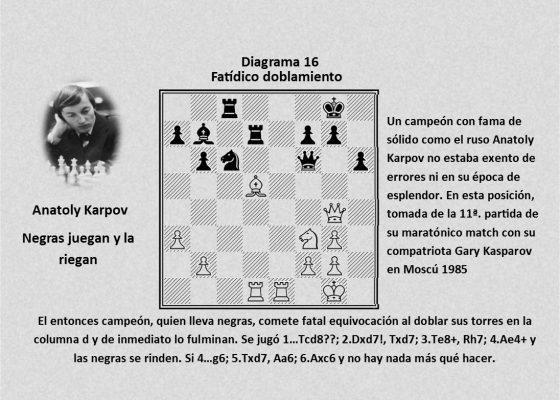 Un campeón con fama de sólido como el ruso Anatoly Karpov no estaba exento de errores ni en su época de esplendor. En esta posición, tomada de la 11ª. partida de su maratónico match con su compatriota Gary Kasparov en Moscú 1985