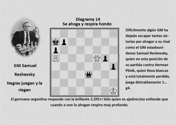 Difícilmente algún GM ha dejado escapar tantas victorias por ahogar a su rival como el GM estadounidense Samuel Reshevsky, quien en esta posición de su partida contra Herman Pilnik, quien lleva blancas y está totalmente perdido, juega distraídamente 1…g4.